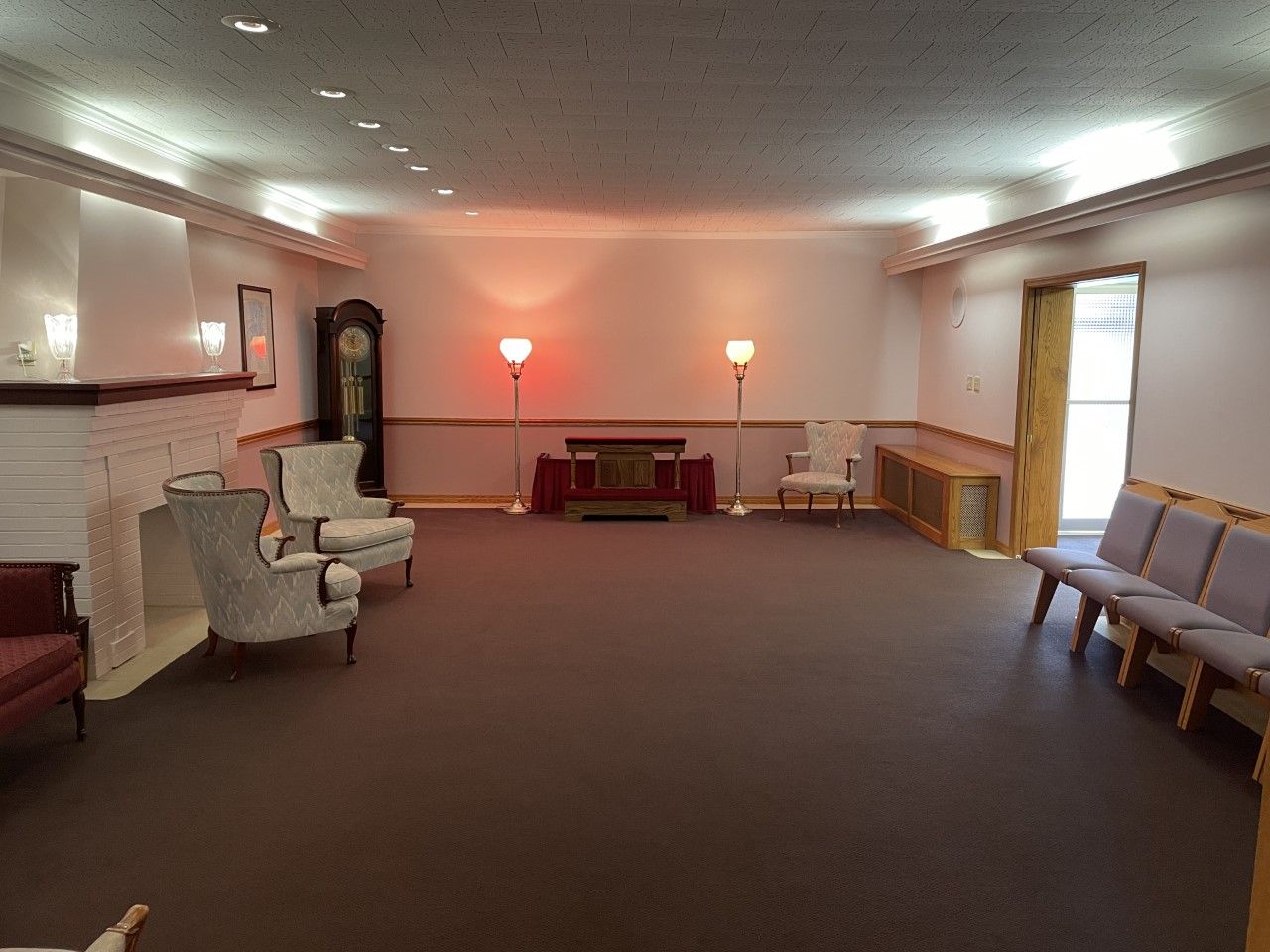 At light, turn left, and the funeral home is grey building immediately on the right, with two parking lots off of the street